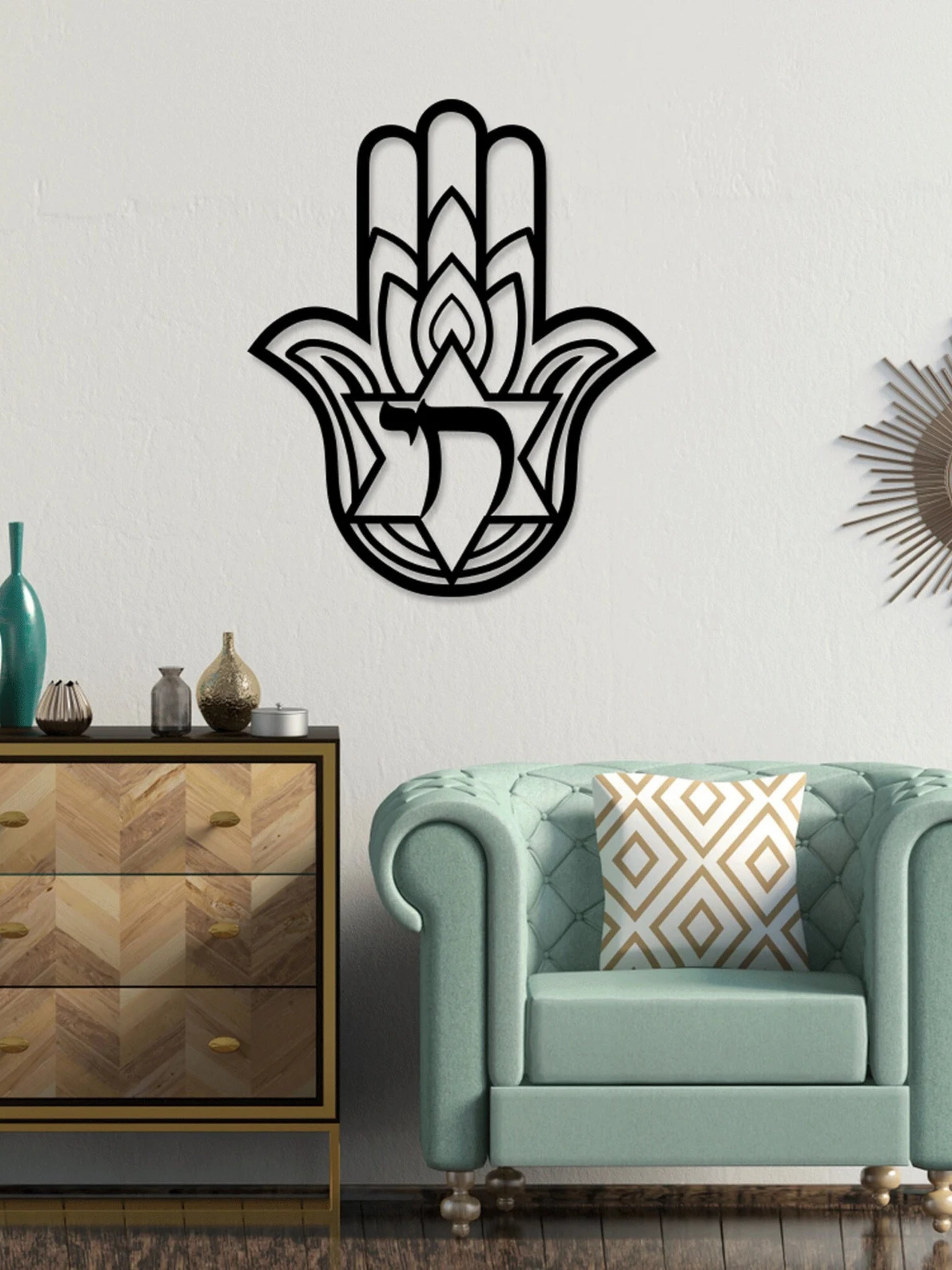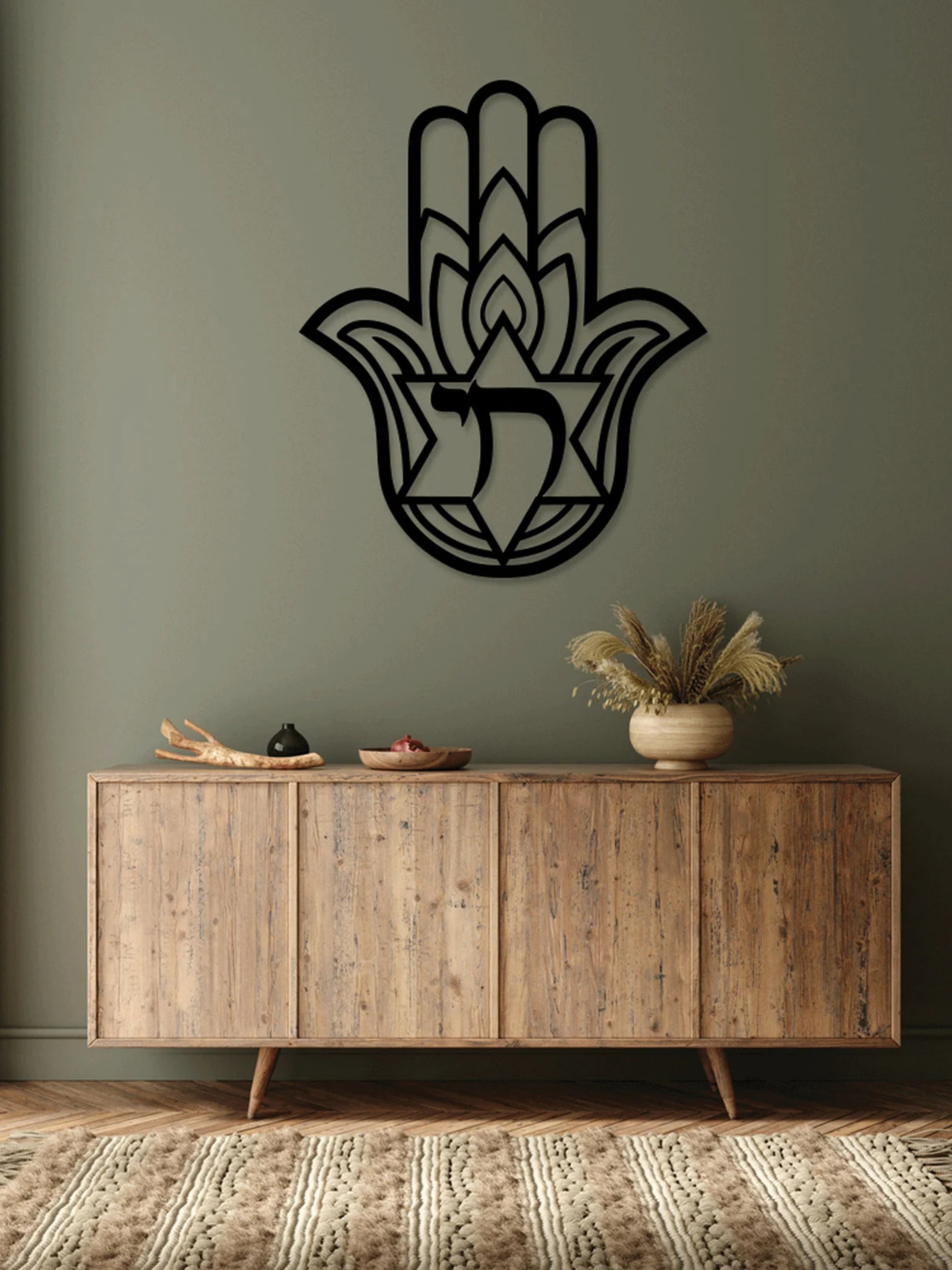 İki kadim ve güçlü koruma sembolü, Hamsa Eli (Fatma'nın Eli) ve Davut'un Yıldızı, modern bir tasarımla evinizi ve sevdiklerinizi sarmak için bir araya geliyor. Kötü enerjilerden korunmayı, şansı, bereketi ve ilahi lütfu simgeleyen bu özel eser, metalin modern dokusuyla mekanlarınıza hem manevi bir derinlik hem de sofistike bir şıklık katıyor.